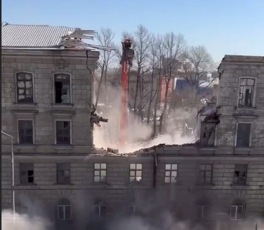 Часть фасада здания НИЦ на Хрустальной улице, дом 1, которое сносят в Санкт-Петербурге, упала на ограждение и проезжую часть. Об этом сообщили градозащитники в Telegram-канале «SOS СПб СНОС». ▶️ЧП затруднило движение автомобилей, которым пришлось объезжать это место по встречной полосе, что создало дополнительные сложности для движения в районе. Обломки с проезжей части убрала специальная техника. 1 апреля градозащитники со ссылкой на правоохранителей уточнили, что объект приобрел статус обладающего признаками культурного наследия, в связи с чем решение об отказе в возбуждении уголовного дела отменено, а работы по сносу приостановлены. 🖼 Скриншот из Telegram-канала «SOS СПб СНОС» 🗞 Telegram | 🗞 Max
