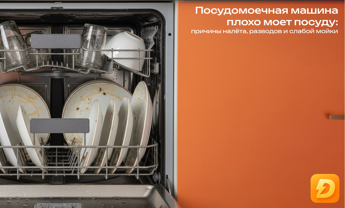 Вы достаёте посуду после цикла — а на ней остаются разводы, налёт или даже остатки еды? Ситуация знакомая: посудомоечная машина плохо моет посуду, хотя вроде бы всё работает. Разберёмся, почему это происходит, что можно проверить самостоятельно и в каких случаях уже нужен ремонт. 1000 ₽ на первый заказ в Дели Дела — приятная скидка, если решите вызвать мастера вместо самостоятельного ремонта. Почему посудомоечная машина плохо отмывает Причин у такой проблемы несколько — от банальных до более серьёзных. 1. Засорились разбрызгиватели