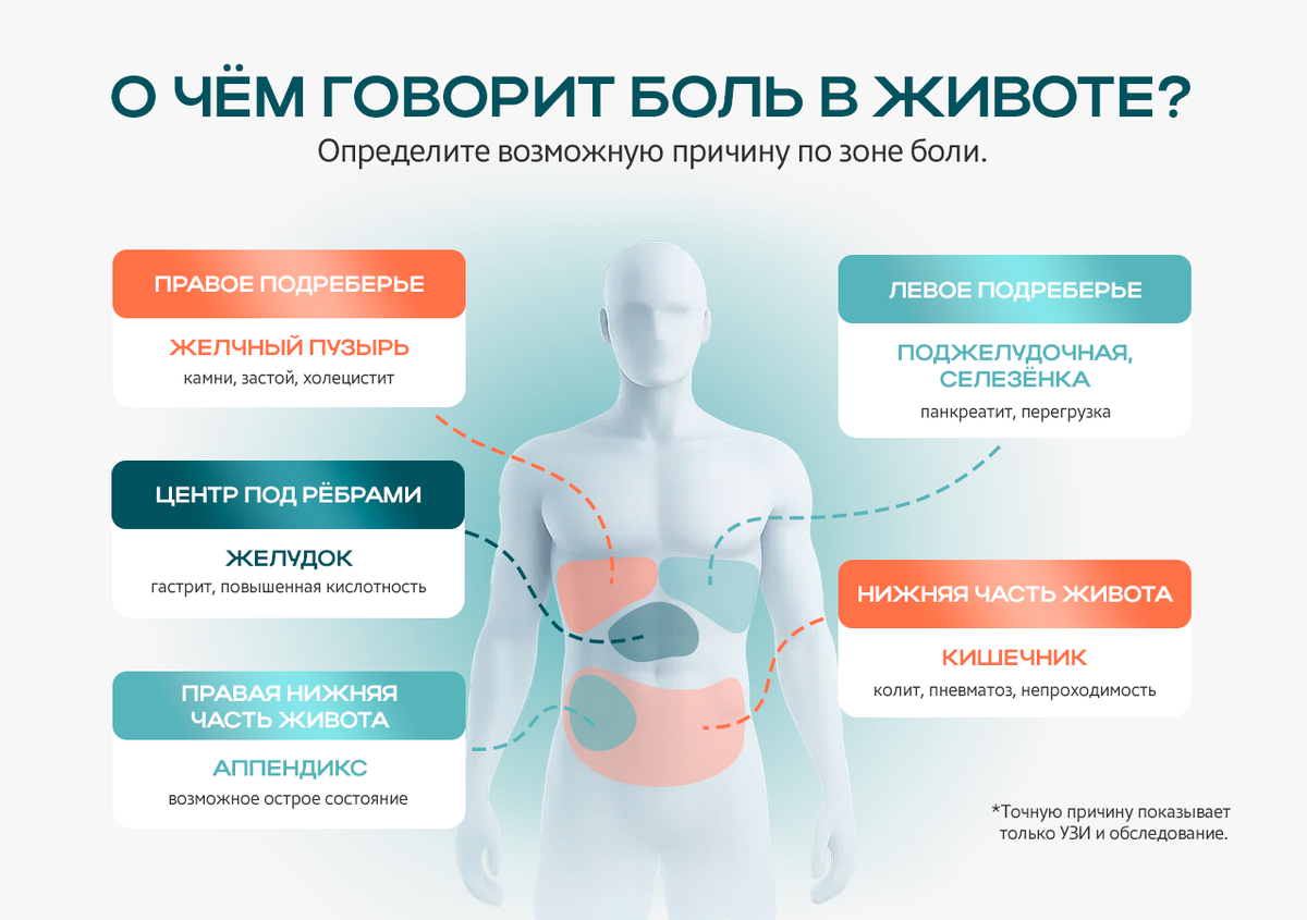 Боль в животе редко возникает просто так, но чаще всего человек теряется, потому что не понимает, какой именно орган даёт сигнал. Ориентироваться можно по локализации боли. Разберём основные зоны. 1. Боль в правом подреберье. Это чаще связано с желчным пузырём. Застой желчи, перегибы, воспаление или камни могут давать тянущую или ноющую боль, особенно после жирной пищи. 2. Боль в левом подреберье. Стоит обратить внимание на поджелудочную железу и селезёнку. При перегрузке поджелудочной боль может быть ноющей или отдавать в спину, сопровождаться тяжестью после еды. 3. Боль по центру, под рёбрами. Это зона желудка. Гастрит, повышенная кислотность или воспаление слизистой часто проявляются именно здесь. Боль может усиливаться на голодный желудок или после еды. 4. Боль внизу живота. Это может быть связано с кишечником. Колит, пневматоз, непроходимость — всё это часто даёт боль именно в этой области. 5. Боль в правой нижней части живота. Не игнорируйте этот симптом. В некоторых случаях это
