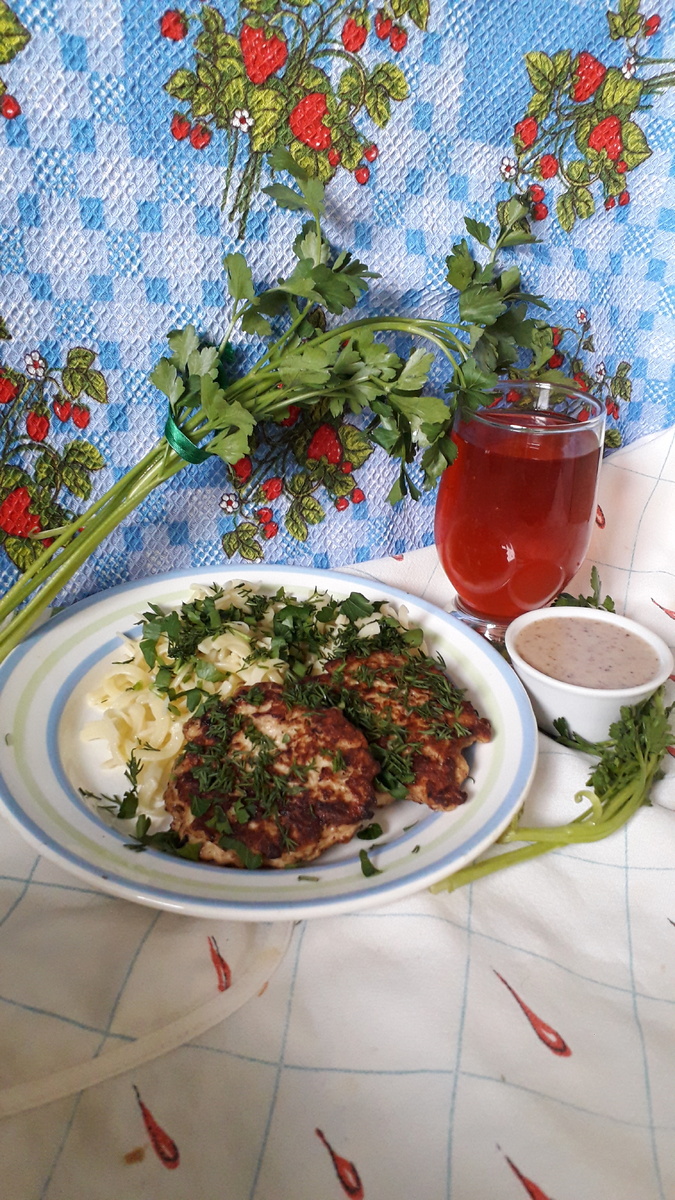 Я продолжаю экспериментировать с рецептами из своей старой кулинарной тетрадки, в неё я записывала, в основном, рецепты из передачи Аллы Будницкой. Скорее всего, многим этот рецепт знаком, но я готовлю по нему первый раз. Ниже я прикреплю фото рецепта из своей книжки, записывала я его дословно, со слов ведущей. В данной рецептуре указаны куриные окорочка, дело в том, что передача выходила в начале 90-х и тогда в нашу страну начали усиленно их завозить, а вот куриного филе в продаже не было. Так что я не стала заниматься разделкой окорочков, а просто купила филе. У меня его полкило, всё остальное как в оригинальном рецепте. 1. Филе куриное 500гр 2. Лук репчатый 3 шт. 3. Яйцо 3 шт. 4. Майонез 3 ст. ложки 5. Крахмал 3 чайн. ложки 6. Чеснок 3 зубчика 7. Соль, перец, специи 1. Филе мелко порубить, я использовала блендер 2. Порубить лук и чеснок мелко, я тоже это сделала блендером 3. Смешать мясо, лук и чеснок. Добавить к ним майонез и перемешать 4. Оставить на некоторое время. Пока смесь о