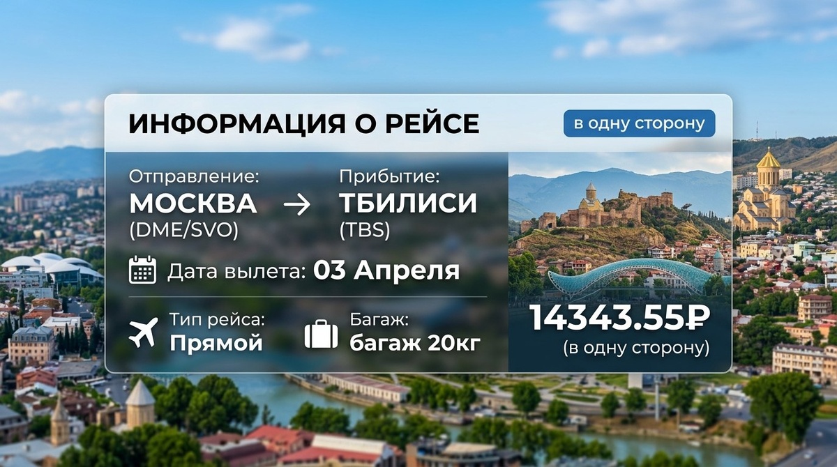 • Москва — Тбилиси, 03 апреля (багаж 20кг) — 14 343₽ • Москва — Стамбул, 05 апреля (багаж 10кг) — 6 315₽ • Новосибирск — Сочи, 05 апреля (багаж 23кг) — 11 002₽ • Москва — Сочи, 07 апреля (багаж 23кг) — 5 136₽ • Сочи — Хургада, 06 апреля (багаж 10кг) — 4 594₽ • Санкт-Петербург — Стамбул, туда-обратно 07–15 апреля (багаж 12кг) — 27 026₽ Бронируйте прямо сейчас, количество мест по таким ценам ограничено.