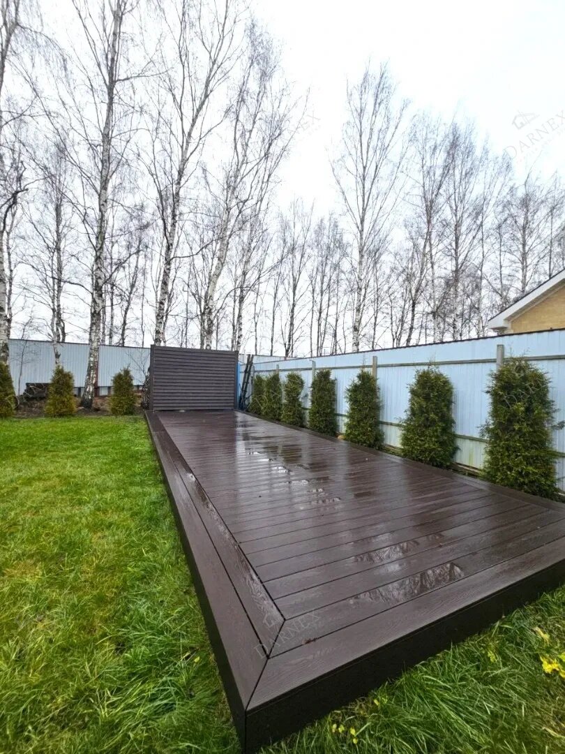 Есть на участках такие места, которые вроде бы и не бросаются в глаза сразу, но именно они часто портят общее впечатление. Уская полоса вдоль забора — как раз из таких. Для клумбы она не всегда удобна, для газона слишком спорная, а просто оставить ее пустой — значит каждый день видеть ощущение недоделаннности. В этом проекте с такой зоной поступили очень точно. Ее не стали перегружать сложными решениями и не пытались выжать из нее все сразу. Вместо этого сделали аккуратный подиум из террасной доски ДПК. Основание собрали на винтовых сваях, затем сделали металлокаркас, смонтировали настил и дополнили его стенкой-жалюзи. На всю работу ушло 4 дня. И в этом как раз сила хорошего решения. Узкое пространство не маскируют, не прячут и не оставляют на потом. Его превращают в полноценную часть участка. После этого зона у забора перестает быть случайным куском земли и начинает работать на весь внешний вид двора. Особенно хорошо здесь сработала геаметрия. Длинная линия забора обычно выглядит ску