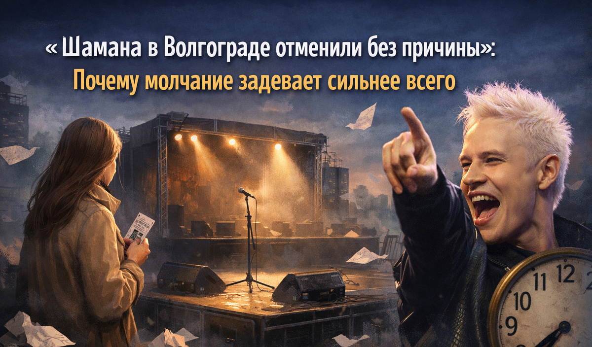 Поговорим об отмене концерта Shaman в Волгограде. Нет удивление, нет какого-то возмущение, а какое-то тревожное ощущение недосказанности. Как будто тебе обещали встречу, ты уже почти дошла до двери, а она вдруг исчезла. Без объяснений причины и записки. Просто пустота на месте ожидания. И я задумалась. Почему нас так цепляют такие новости? Почему это превращается в повод для внутреннего диалога и даже беспокойства? Я говорю честно, меня задело не само событие. Концерты отменяются постоянно. Болезни, логистика, деньги, ошибки. Но здесь нет ответа. И вот это отсутствие объяснения словно говорит зрителю что он не заслуживает даже короткого человеческого комментария. Я представляю девушку, которая купила билет. Возможно, она откладывала деньги. Возможно, это был подарок самой себе. Она выбрала платье, спланировала вечер. И вдруг ей просто возвращают деньги или закрывают продажу. А где уважение к ее ожиданию? Где хотя бы попытка сказать, что произошло? Вы когда-нибудь сталкивались с таким?