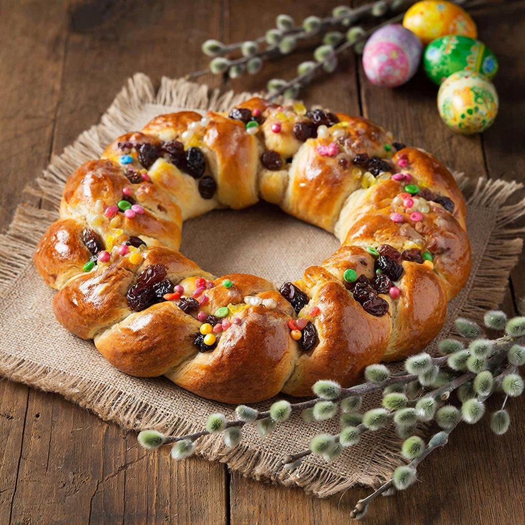 Пасхальный венок — это традиционная праздничная выпечка, символизирующая вечную жизнь и воскресение. В старину венки плели не только из веточек вербы, но и выпекали из сдобного теста, украшая их сухофруктами, орехами и глазурью. В центр венка часто ставили крашеные яйца — так выпечка превращалась в настоящее произведение искусства и центр пасхального стола.