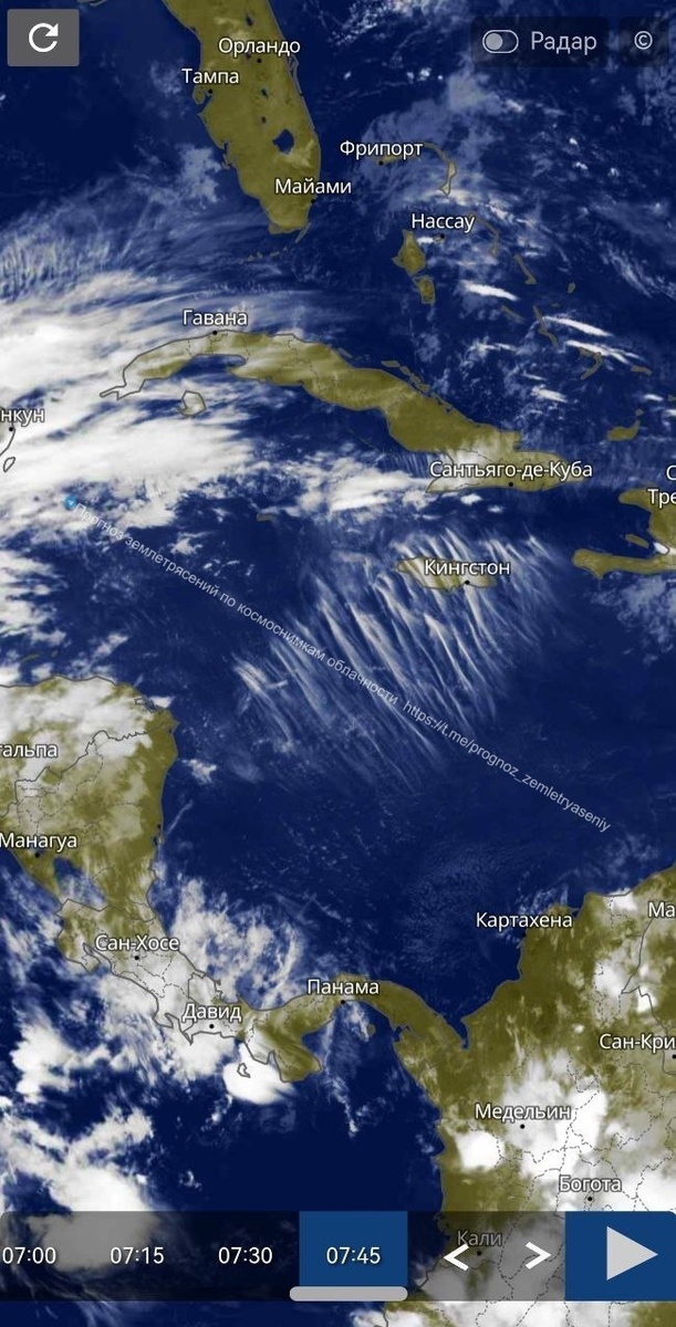 Есть дополнительные признаки того, что Центральная Америка или Карибская плита, вероятно, скоро разрозится сильным землетрясением (М6-7+). Инфразвук и неустойчивость Кельвина-Гельмгольца присутствуют. ===== There are additional signs that Central America or the Caribbean plate is likely to be disrupted by a major earthquake (M6-7+) soon. Infrasound and Kelvin-Helmholtz instability are present.