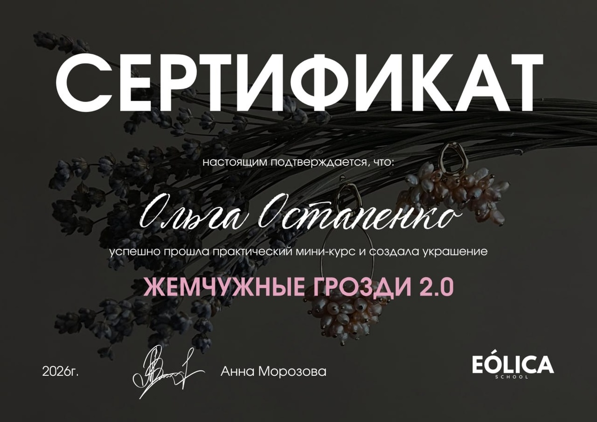 ! ✨ Друзья, хочу поделиться с вами своей радостью и гордостью! Я успешно прошла практический от замечательной EolicaSchool и получила официальный сертификат! 🤩 Это не просто документ, а подтверждение того, что я постоянно развиваюсь, оттачиваю свое мастерство и ищу новые, еще более совершенные техники, чтобы создавать для вас по-настоящему уникальные и изысканные украшения. Для меня это значит еще больше вдохновения, свежих идей и, конечно же, новых шедевров, которые будут радовать вас своей красотой и неповторимым стилем. Что ждет вас в ближайшее время? Конечно, новые вариации моих любимых украшений, созданные с применением всех полученных знаний! Следите за обновлениями! #Ollibijou #АвторскиеУкрашения #РучнаяРабота #Сертификат #РазвитиеМастера #ЖемчужныеГрозди #EolicaSchool #Обучение #ДизайнерскиеУкрашения #БижутерияРучнойРаботы #Мастерство #Творчество