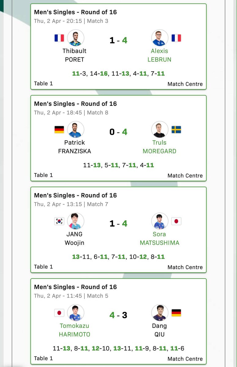 👁️ Первый день основной сетки Кубка мира. Пока на вялом. Матч дня вышел на самом старте с семисетовой победой Харимото над Чу Даном. Трулс разобрал своего одноклубника Францизску. Матсушима продолжает показывать уровень. Из-за «великолепной» жеребьевки 5-ый и 6-ой номер женского посева слетают уже к 1/4. Завтра день должен быть пободрее. Матч дня Чучин - Феликс в 13:45 по МСК. Время по МСК -5.