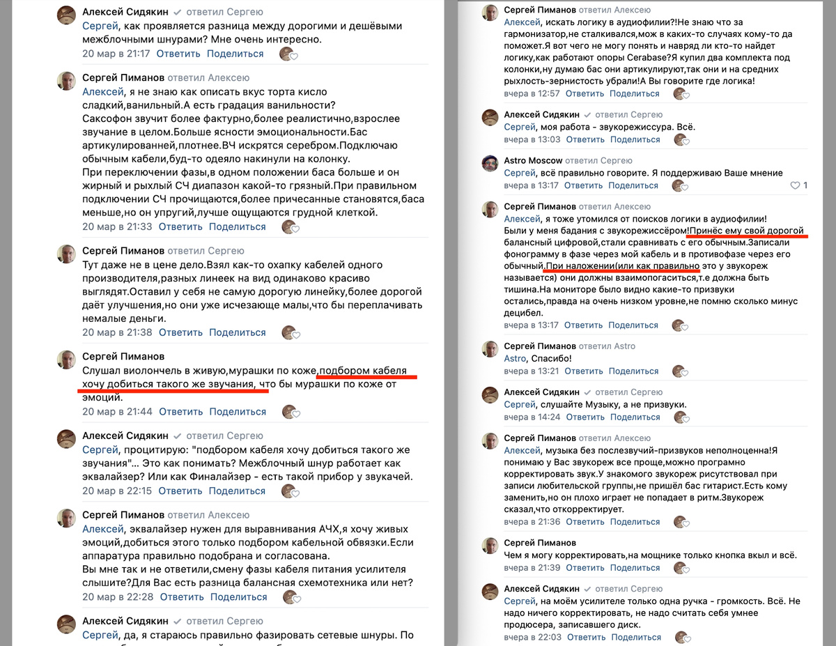 Хай-Фай! Признаюсь, не ожидал, что для некоторых аудиофилов процесс "отслушивания" проводов примет такие фатальные масштабы. В то время, когда нормальные люди слушают Музыку, кордофилы мучают шнуры, превращая эти самые обычные проводники в эквалайзеры и финалайзеры. Мне понравилась позиция звукорежиссёра, о котором идёт речь на скриншотах. Терпеливо и со знанием дела он продемонстрировал оголтелому кордофилу, что нет разницы в балансном подключении между дорогим и обычным шнуром. Во всех студиях мира применяются самые обычные шнуры по тридцать баксов штука. Никто и нигде в профессиональном секторе не станет платить за банальный провод тысячу долларов. Никто! В общем, слушайте Музыку, Квины творили Богемскую рапсодию без применения "волшебных" шнурков.