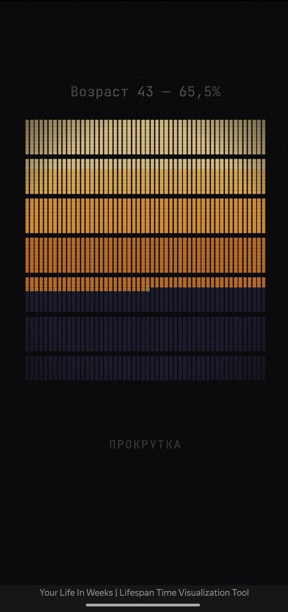 ⏳ Так называется сайт, который по введенным данным о дне рождения, гендере и стране проживания рассчитывает среднюю продолжительность жизни и рисует визуализацию вашей жизни из блоков. Каждый блок — одна неделя, цветные блоки — прожито, темные — осталось прожить. Для усиления эффекта, что «стакан наполовину пуст», вам показывают в натуральном выражении остаток вашей жизни — сколько осталось понедельников, сколько летних сезонов, стрижек и т.д. Мы склонны переживать, если зря потратили деньги, но легко миримся с тем, что напрасно потеряли время. Это потому, что нам кажется, что деньги конечны, а время нет. Хотя, на самом деле, все ровно наоборот. Mikhail Tokovinin Для меня этот «мотивационный» сайт отмерил прожить еще 22 года или 1 191 неделю, т.е 65 лет — видимо как средняя продолжительность жизни мужчин в стране, хотя Kamalama давал на 10 лет больше. Развлекайтесь 🦑 #смотричтонашёл