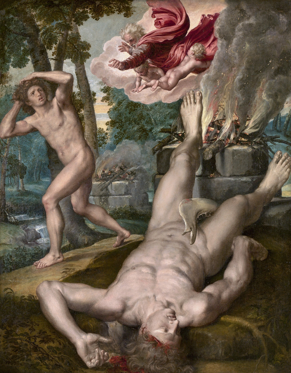 Согласно Книге Бытия (Быт. 1:4, 3-12), сыновья Адама приносили жертвоприношения Богу, и ему понравились дары Авеля, но не Каина. Завидуя своему брату, Каин убил Авеля (забив до смерти челюстью осла), и навлёк этим на себя гнев Божий и изгнание. Фламандский художник Михиль Кокси (1499-1592) на рассматриваемой картине изобразил момент сразу после преступления. Авель лежит на спине, челюсть покоится на его теле, а Бог на небе изгоняет Каина. На заднем плане видны два костра с жертвоприношениями. Жертва Авеля, которая понравилась Господу, больше, поскольку принесенные им дары были лучшими из того, что у него было, в отличие от скудного выбора, предложенного Каином. На картине прослеживается влияние итальянской живописи на Кокси, особенно в крепком теле Авеля, которое, вероятно, было вдохновлено фигурой Христа из «Страшном суде» Микеланджело в Сикстинской капелле. Несмотря на то, что Кокси был одним из любимых художников Филиппа II, эта картина появилась в Испании только в 1746 году,