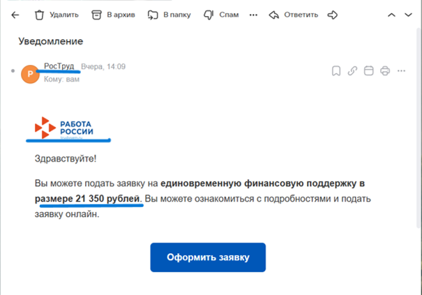 Открываю сегодня почту и обнаруживаю интересное письмо от РосТруда, где предлагают финансовую поддержку в размере 21350 руб. Здорово, правда?! Так великодушно со стороны государства в текущие непростые времена позаботиться о своих гражданах и оказать каждому финансовую поддержку. Или это только мне выпала такая честь?!