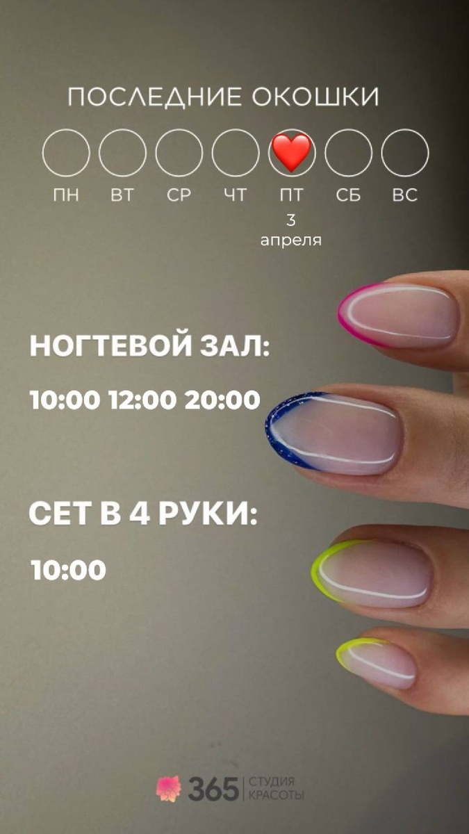 🌺 Пусть этот день принесет вам много радости и улыбок!😇😁😊 #красота #наслаждение #забота #весна #любовь #мечты сбываются #радость #возможности ЧТО МОЖНО УСПЕТЬ СДЕЛАТЬ 03 апреля 2026 года : Ногтевой зал: 10:00 12:00 20:00 Сет в 4 руки:10:00 Парикмахерский зал: ближайшая запись на 04 апреля Косметология/шугаринг: Ближайшая запись на 04 апреля Оформление бровей и ресниц : ближайшая запись на 05 апреля ЗАПИСАТЬСЯ МОЖНО ЛЮБЫМ УДОБНЫМ СПОСОБОМ: 👉🏻 Сообщение в Whats'app https://wa.me/79663654477 👉🏻По телефону +79663654477 👉🏻Онлайн запись https://n286444.yclients.com/ #команда365 #красота #наслаждение #забота #весна #март #любовь #мечтысбываются #радость #возможность