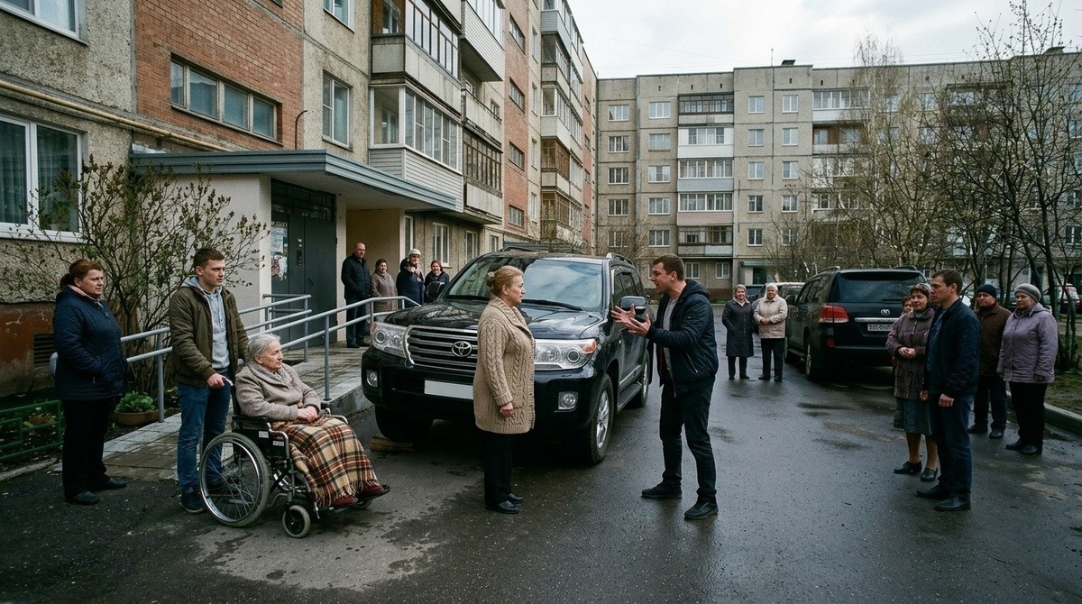 Я вышла во двор около десяти. Валентина Ильинична с пятого этажа уже ждала у подъезда – в инвалидной коляске, с пледом на коленях. Молча смотрела на бампер, перекрывший ей спуск. Рядом топтался её внук Серёжа, студент.