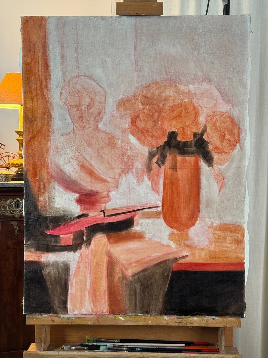 Сделали рисунок и первый слой. Поговорили о стиле, о композиции и цвете...
