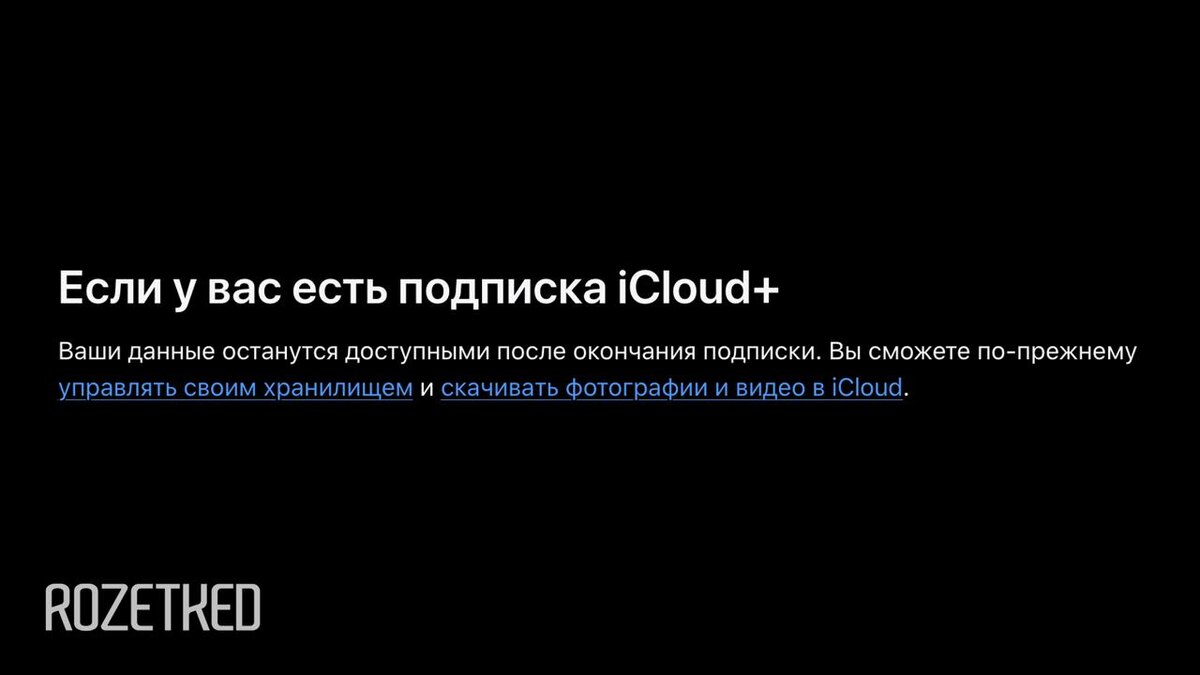 Или нет? На сайте поддержки Apple появилось сообщение, что у подписчиков iCloud+ из России останется доступ к данным в «облаке» даже после окончания подписки. Эту же информацию частично подтверждает техподдержка в чате. Однако, вероятно, речь идёт не о бесплатном доступе к iCloud+ навсегда, а только о том, что фото и видео не будут удаляться — но доступ к ним пропадёт через месяц после окончания подписки, и вернуть его можно будет, продлив подписку. Подробнее: rozetked.me/news/45289