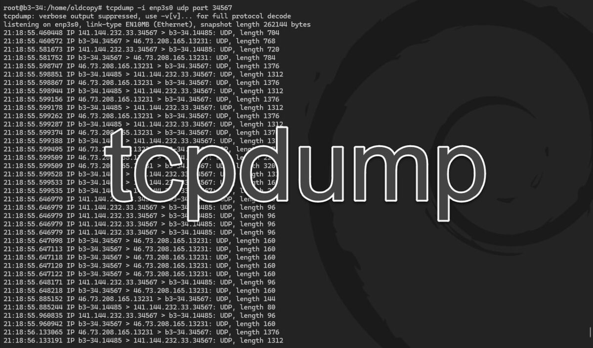 При диагностике сетей очень важно убедиться в том, что нужные пакеты приходят на нужный узел и не просто приходят, а соответствуют критериям, которые вы указали в правилах фильтрации. Иначе можно долго гадать, что происходит и почему не работает то, что «по идее» должно работать. Поэтому не будем гадать, а просто посмотрим трафик своими глазами, в этом нам поможет утилита tcpdump. Для ее установки выполните: apt install tcpdump После чего запустите ее с ключом -D, чтобы посмотреть какие интерфейсы в системе она видит и откуда может слушать трафик. tcpdump -D Далее мы можем просто запустить: tcpdump -i enp3s0 И сразу утонем в количестве информации, разобраться в которой будет решительно невозможно, поэтому, чтобы получить выжимку мы будем использовать фильтры, самые популярные из них: ▫️port ▫️host ▫️src ▫️dst ▫️tcp ▫️udp ▫️icmp Например, мы хотим посмотреть все пакеты с портом назначения UDP 34567: tcpdump -i enp3s0 udp dst port 34567 Указанную нами конструкцию следует чита
