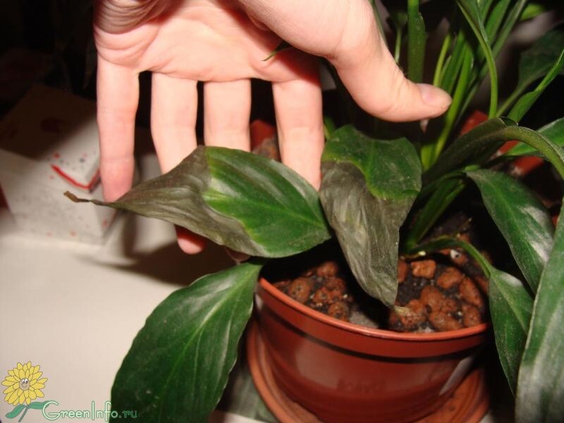 Что делать: Поставьте горшок в таз с теплой водой на 30 минут. Земля пропитается равномерно. Спатифиллум любит, чтобы грунт был всегда слегка влажным, но не сырым.