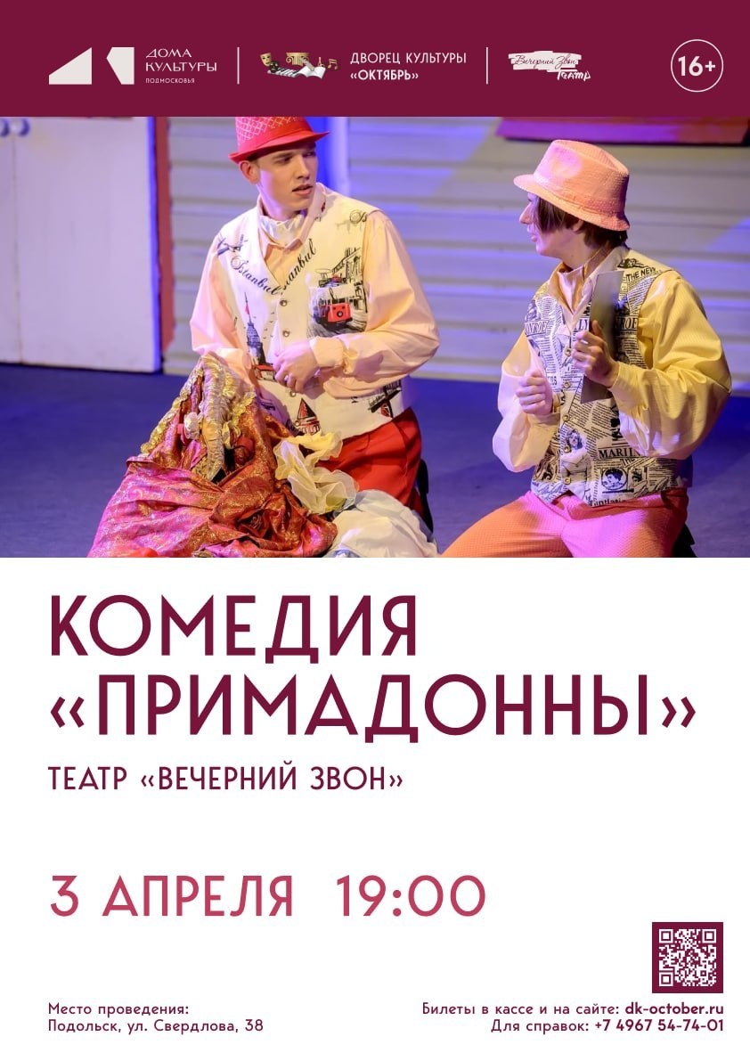 ✨ Комедия «Примадонны» 🔔Театр «Вечерний звон» представляет. 😊Пара молодых актёров решает подзаработать, приняв участие в розыгрыше наследства богатой тёти. 🫶Комичная путаница, шутки и нелепые ситуации сопровождают героев в их приключениях, пока они добиваются своего наследства. ⌛ Продолжительность спектакля — 1 ч 50 мин. 🚫 Возраст: 16+ 📆 03.04.2026 🕒 19:00 🏢 Дворец культуры «Октябрь» 📍 г. Подольск, ул. Свердлова, д.38 💰 Цена от: 600 до 800 ₽ 🔗 Купить билет: https://clck.su/AblAL ⭐Поддержать канал голосом 🍰Где поесть в Подольске ✅ Мероприятия Подольск https://dzen.ru/id/66ed500f7b5671493eca3fd6 https://vk.ru/podolsk_events http://dzen.ru/podolsk_events