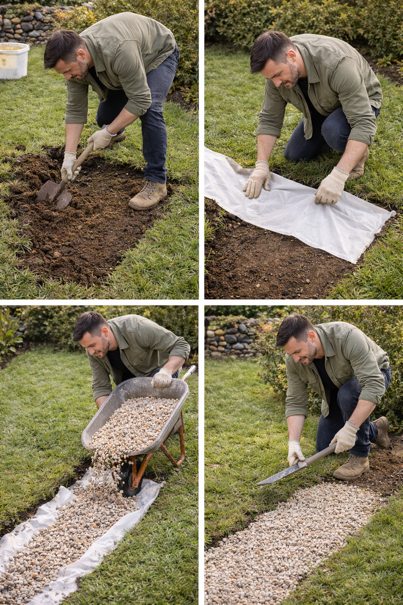 Когда мы обустраивали участок, одна из первых проблем была — дорожки. После дождя всё превращалось в грязь, а ходить по траве быстро надоело. Хотелось сделать аккуратно, красиво и удобно. Но когда начинаешь смотреть цены на готовую плитку и работу мастеров, сумма может легко уйти в десятки или даже сотни тысяч рублей. Поэтому я начал искать способы сделать дорожки самостоятельно и максимально дешево. За несколько лет перепробовал разные варианты — и некоторые оказались очень удачными. Рассказываю про 5 бюджетных способов, которые можно сделать своими руками. Это один из самых дешёвых способов сделать дорожку. Что понадобится: Сначала снимают верхний слой земли примерно на 10–15 см. После этого на дно укладывают геотекстиль. Он не даёт сорнякам пробиваться через дорожку. Затем насыпают слой щебня и разравнивают. Такая дорожка выглядит аккуратно и хорошо пропускает воду. Плюсы: ✔ очень дешево