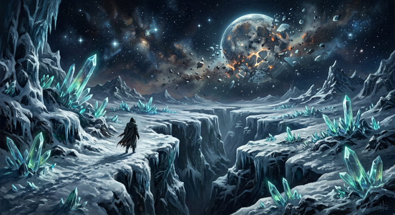Перед ним простиралась бескрайняя белая пустыня. Чёрное небо, усыпанное звёздами, будто вырезанными из чистого льда. А над горизонтом — маленькое, бледное солнце, еле тёплое, словно угасающая свеча. По всей равнине из‑под снега под невозможными углами вырастали прозрачные кристаллы — идеальные геометрические фигуры, звонкие, хрупкие и мёртвые. Они ловили свет и разбивали его на тысячи иголок, превращая мир в хрустальный лабиринт.