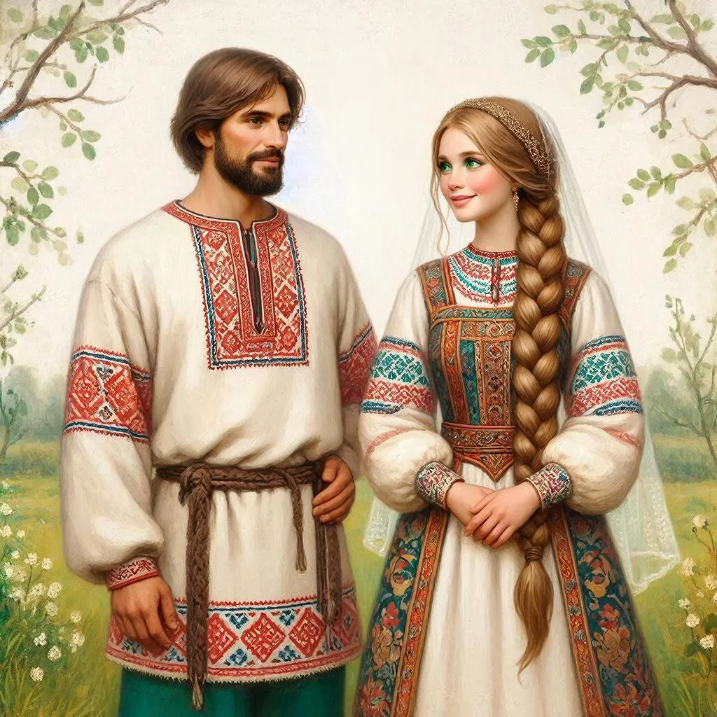 Свадьбу сыграли шумную, весёлую, такую, что потом долго вспоминали всей деревней. Столы ломились от яств: хмельной мёд лился рекой, пироги с рыбой и мясом, жареные поросята, солёные грибы, мочёные яблоки, кисели и взвары — чего только не было. Гости веселились от души, пели песни, плясали до упаду, и даже старики, глядя на молодых, прослезились и вспомнили свою молодость. Егор, важный и счастливый, не сводил глаз с Маши, которая в свадебном наряде — в белой рубахе с красной вышивкой, в расшитом сарафане, с венком из полевых цветов в русой косе — была прекрасна, как сама весна. Водили хороводы, желали молодым совет да любовь, деток здоровых, да дому полную чашу.