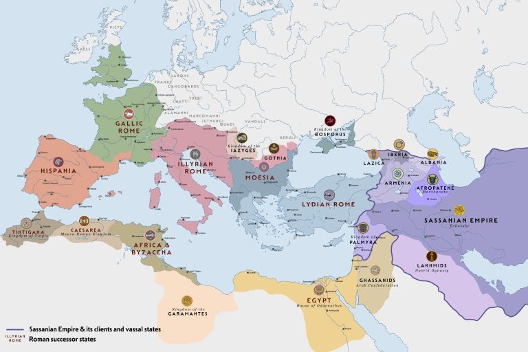 На востоке ситуация развивалась еще более драматично. Греческий мир и западная часть Малой Азии объединились вокруг нового центра силы — Лидийского Рима. Это государство, контролировавшее Эгейское море и побережье Анатолии, стало главным бастионом эллинистической культуры. Однако дальше на восток римский орел больше не реял. Сасанидская империя, воспользовавшись хаосом, не только разгромила Пальмирское царство, но и подчинила себе весь Ближний Восток. На карте это видно по огромной фиолетовой зоне, поглощающей Месопотамию и Иран. Пальмира и Египет не исчезли бесследно: Египет стал домом для династии Одената, создавшей свое собственное царство, вероятно, как вассал или партнер Персии. Армения, Иберия и Албания стали буферными зонами, а арабские конфедерации Гассанидов и Лахмидов превратились в мощные клиентские государства, охраняющие границы персидского мира.