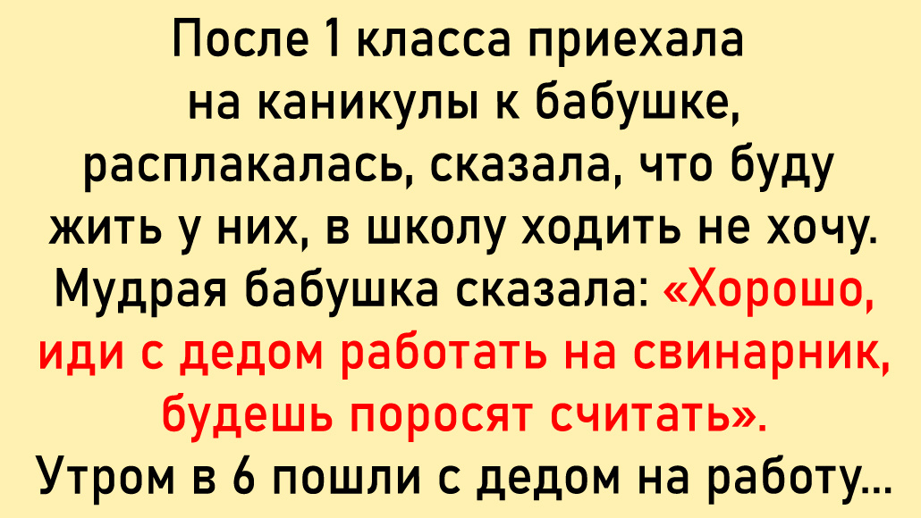 После 1 класса приехала на каникулы к бабушке, расплакалась, сказала, что буду жить у них, в школу ходить не хочу. Мудрая бабушка сказала: «Хорошо, иди с дедом работать на свинарник — будешь поросят считать». Утром в 6 пошли с дедом на работу. Он заставлял заходить к свиноматкам, пересчитывать поросят. Они были ужасно большие, мне было страшно, там жутко воняло. После первого рабочего дня (до обеда) заявила, что лучше буду в школу ходить.