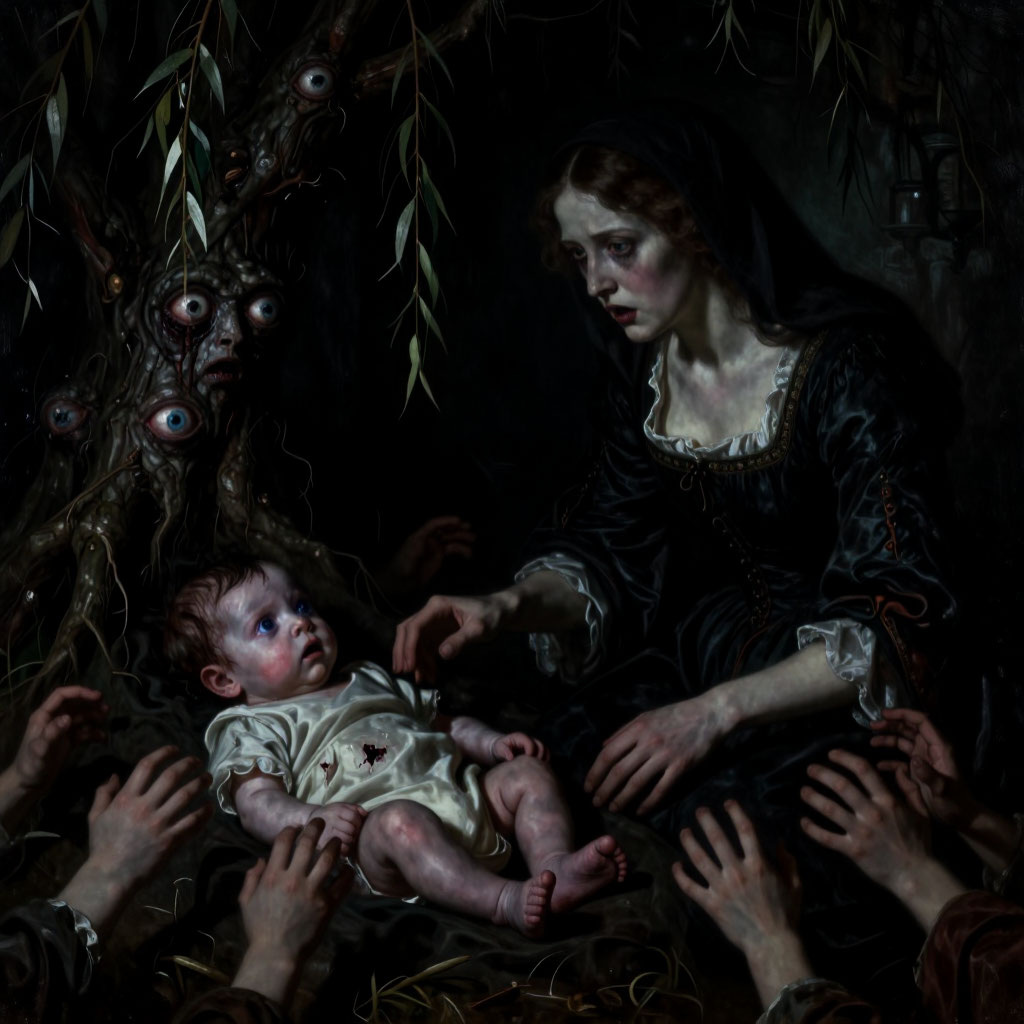 Адельгейда смотрела на существо, которое было собрано из сорока мертвых младенцев, и не могла отвести взгляд. В нём не было ничего человеческого — только слепое, голодное желание быть любимым. И в тот миг, когда оно повернуло к ней свою пустую голову, графиня поняла, что любит его. По-настоящему. Глубоко. Так, как не любила ни одного живого.