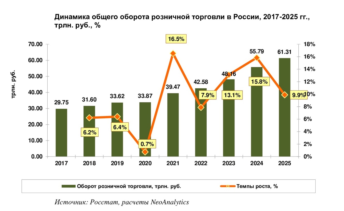 Объем российской розничной торговли по итогам 2025 г. увеличился