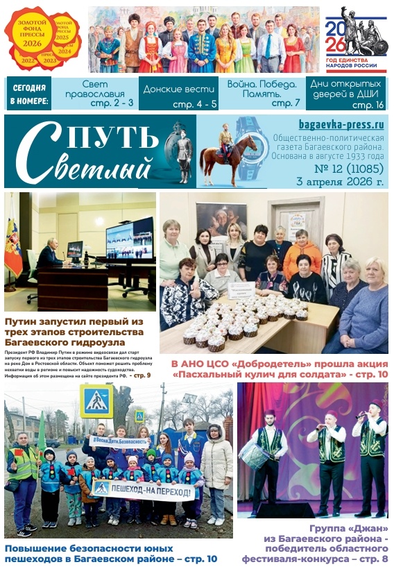 Свет православия. Лазарева суббота- 4 апреля. Вход Господень в Иерусалим — 5 апреля. БЛАГОВЕЩЕНИЕ ПРЕСВЯТОЙ БОГОРОДИЦЫ — 7 апреля — стр. 2-3 ВОЙНА. ПОБЕДА. ПАМЯТЬ. История донской казачки, которая вынесла на своих плечах век казачьей боли — и не согнулась — стр. 7 В отделении социальной реабилитации х. Ёлкин СРЦ Багаевского района прошёл урок мужества «Героями не рождаются, героями становятся» — стр. 7 Группа «Джан» из Багаевского района — победитель областного фестиваля-конкурса — стр. 8 Открытие «Недели детской книги» в Багаевской детской библиотеке — стр. 8 ВОСПИТАТЕЛИ – АРТИСТЫ, ДЕТИ – ЗРИТЕЛИ: встреча с миром театра в детском саду «Золотой ключик» — стр. 8 Владимир Путин дал старт запуску первого из трех этапов строительства Багаевского гидроузла — стр. 9 Чистота станицы — залог комфортной жизни — стр. 9 В Багаевском районе завершился ямочный ремонт на нескольких ключевых улицах — стр. 9 В АНО ЦСО «Добродетель» прошла акция «Пасхальный кулич для солдата» — стр. 10 Фестиваль ГТО ср