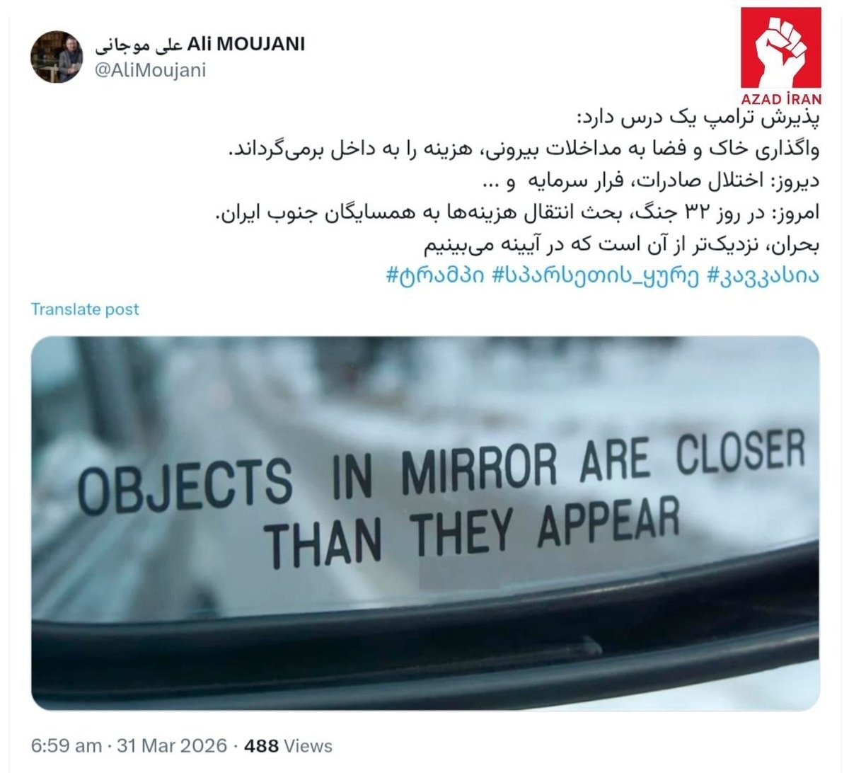 ⚠️ Посол Али Муджани в X фактически пригрозил Тбилиси: кто открывает воздушное пространство и территорию для иностранного вмешательства, дорого за это заплатит. Подпишитесь на канал