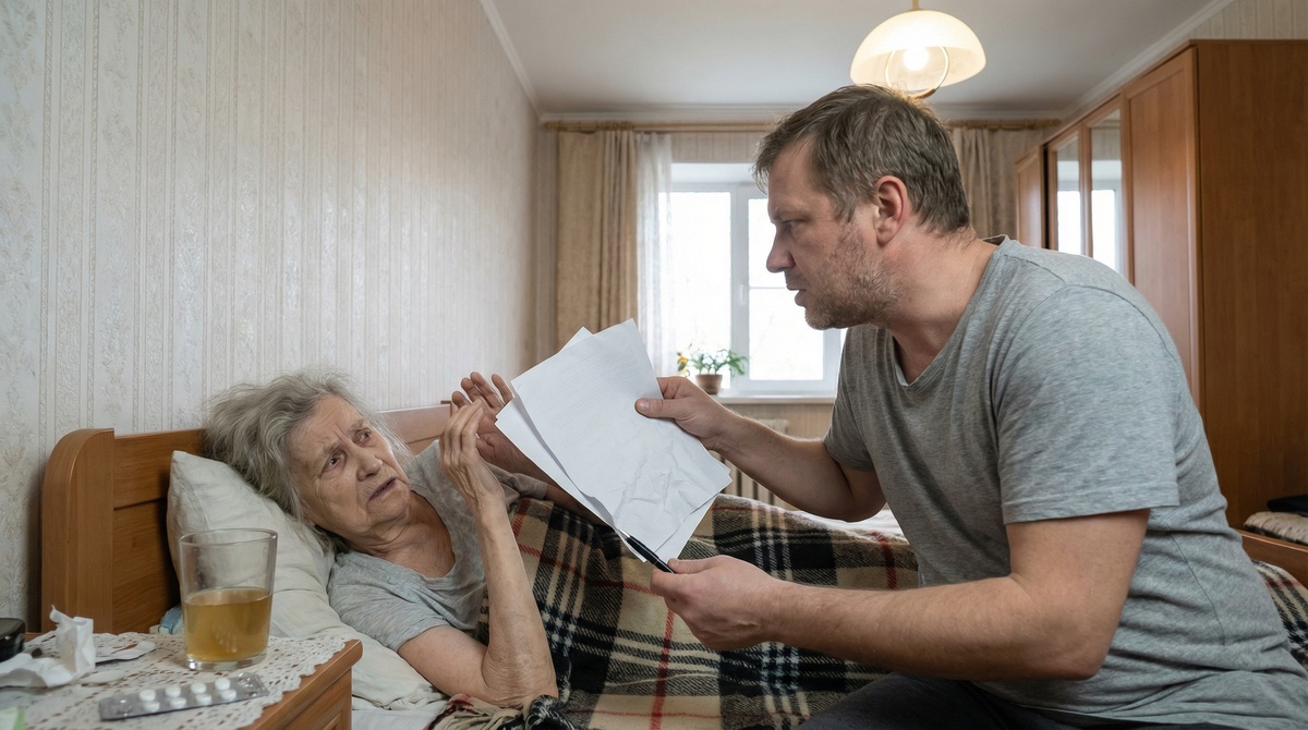 Костя подошел к кровати. В руках у него были те самые документы из прихожей. Он не стал поправлять одеяло. Он бросил листы прямо на ноги Нине Васильевне.