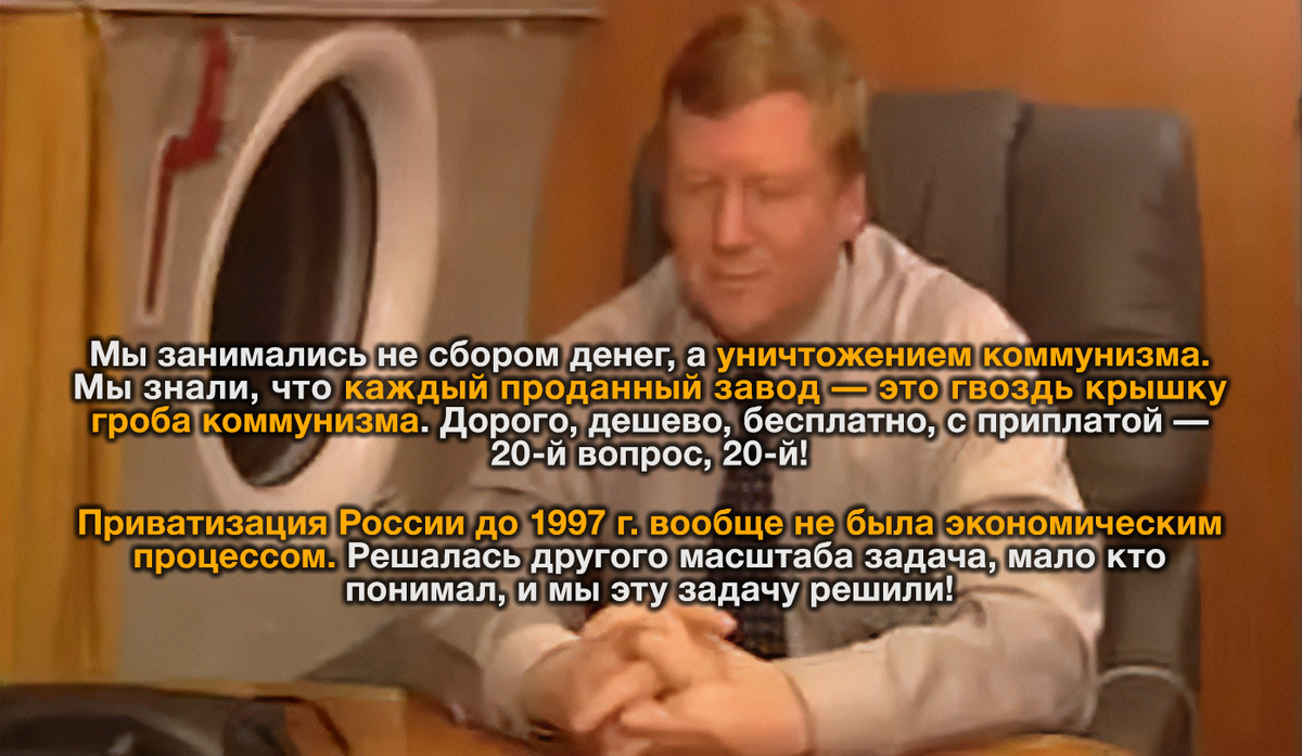 Большинство россиян давно считает приватизацию 90-х не только аморальной, но и грабительской. И с этим сложно не согласиться, помня как это всё происходило, когда построенное всем советским народом за 70 лет внезапно перешло в собственность кучке ушлых ребят типа нынешнего Дерипаски по схеме "было ваше, стало наше!". Причем, перешло по каким-то символическим ценам, буквально за копейки, о чем с гордостью рассказывал инициатор и непосредственный участник этого процесса -- Чубайс, называя этот, плохо прикрытый грабеж не экономическим процессом, а уничтожением коммунизма: Так что это можно смело назвать крупнейшим хищением социалистической собственности, совершенным с особым цинизмом. И то, что тут экономикой даже не пахло, подтверждают цифры паблика "Простые числа": Экономический эффект от распродажи государственного имущества для бюджета был мизерным. В 1992-1996 годах под нож пошли почти 130 тысяч предприятий и объектов. Это давало лишь 0,4-1,4% доходов казны. А всего за 1992-1998 годы