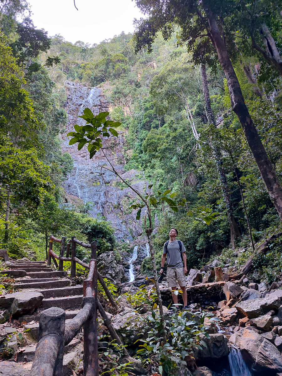 Первой достопримечательностью на острове после обрядов аренды машины и заселения в отель, стала поездка к водопаду. Один из самых популярных и легкодоступных на острове водопад произвёл на нас хорошее впечатление, в особенности потому что вечером здесь никого не было. Мы погрузились в полную "тишину" джунглей. Самый высокий водопад на острове. Он падает с высоты около 200 метров тремя впечатляющими ярусами. Водопад наиболее впечатляет в сезон дождей, с сентября по октябрь, когда поток воды достигает максимальной силы, сейчас водопад неполноводен. У водопада большая парковка, по крайней мере вечером бесплатная, как и вход. Территория благоустроена, сейчас на вид немного в запустении. Разбойники обезьяны растащили повсюду мусор из мульд. Удобная дорожка, столы для отдыха и пикника. Водопад расположен в северной части острова, стекая с крутых склонов горного хребта Гунунг Мат Синканг.