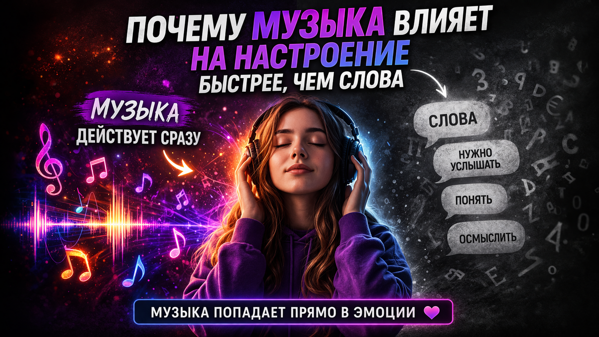 Без объяснений. Без мыслей. Почему музыка действует быстрее, чем любые слова? Слова нужно: А музыка работает иначе — она сразу бьёт по эмоциям. Ты ещё не понял текст,