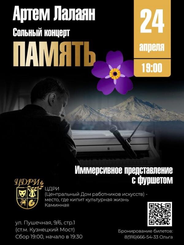 24 апреля в Москва пройдет сольный концерт «Память» Артёма Лалаяна, приуроченный ко Дню памяти жертв Геноцида армян в Османской Турции. Мероприятие станет не только музыкальным событием, но и важным актом исторической памяти. «Память» — это час живой, искренней музыки Артёма Лалаяна, где каждая нота звучит как молитва, а каждый аккорд становится прикосновением к истории. Концерт сопровождается масштабным визуальным рядом: на большом экране зрителям будет представлен фильм о пути армянского народа — от древних корней и трагических страниц прошлого до света современной созидательной силы. Организаторы подчеркивают, что это не просто концерт, а глубокое эмоциональное переживание, объединяющее память и надежду. Мероприятие состоится в Центральный Дом работников искусств по адресу: г. Москва, ул. Пушечная, 9/6, стр. 1 (ст.м. «Кузнецкий мост»). Организаторы выделяют несколько причин, по которым это событие заслуживает внимания: Главная мысль, заложенная в концерте, — необходимость сохранять
