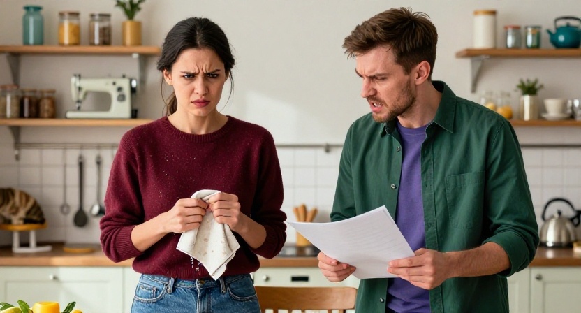 Он стоял у стола с папкой в руках, гладко выбритый, в своей офисной куртке, с лицом человека, который целый день сдерживался на работе и теперь пришёл домой законно выпускать пар.