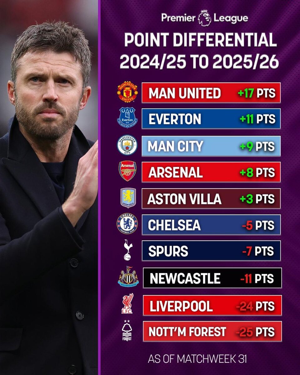 Наибольшая разница в набранных очках (в плюс или минус) у команд Премьер-Лиги в этом сезоне относительно прошлого. У "Манчестер Юнайтед" сейчас на 17 очков больше, чем было после 31 матча год назад 📊