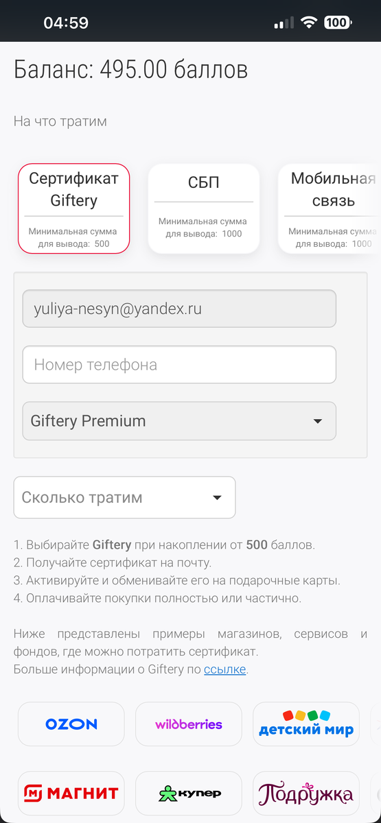 За 500 баллов можно получить сертификат на шопинг. Я беру в «Магните» и покупаю продукты. Можно накопить 1000 рублей и перевести на карту банка по СБП.