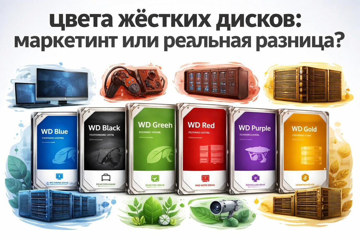 Когда я впервые услышал, что жёсткие диски бывают синими, чёрными, красными и даже фиолетовыми, то подумал: ну, просто бренды хотят, чтобы мы покупали больше. Ну покрасили наклейку, и что с того? Однако позже выяснилось, что за каждым цветом стоит своя история. И тут самое интересное: а что именно меняется? Прошивка, железо, подшипники — или всё вместе? Давайте разбираться по-простому, без сложных схем. Кто придумал цветную маркировку? Western Digital. Именно эта компания сделала цвета своим фирменным знаком. У Seagate и Toshiba тоже есть цветные серии, но их логика немного другая. Главное, что нужно знать: цвет — это не дизайн, а инструкция по применению. Что скрывается за цветами WD? Так что же разного: прошивка или механика? И то, и другое. Но с оговорками. Возьмём WD. У них внутри одной линейки (например, на 1 ТБ) у синего, зелёного, красного и фиолетового часто одна и та же платформа — одинаковые пластины, головки, мотор. Но: То есть железо может быть одинаковым, а поведение — раз