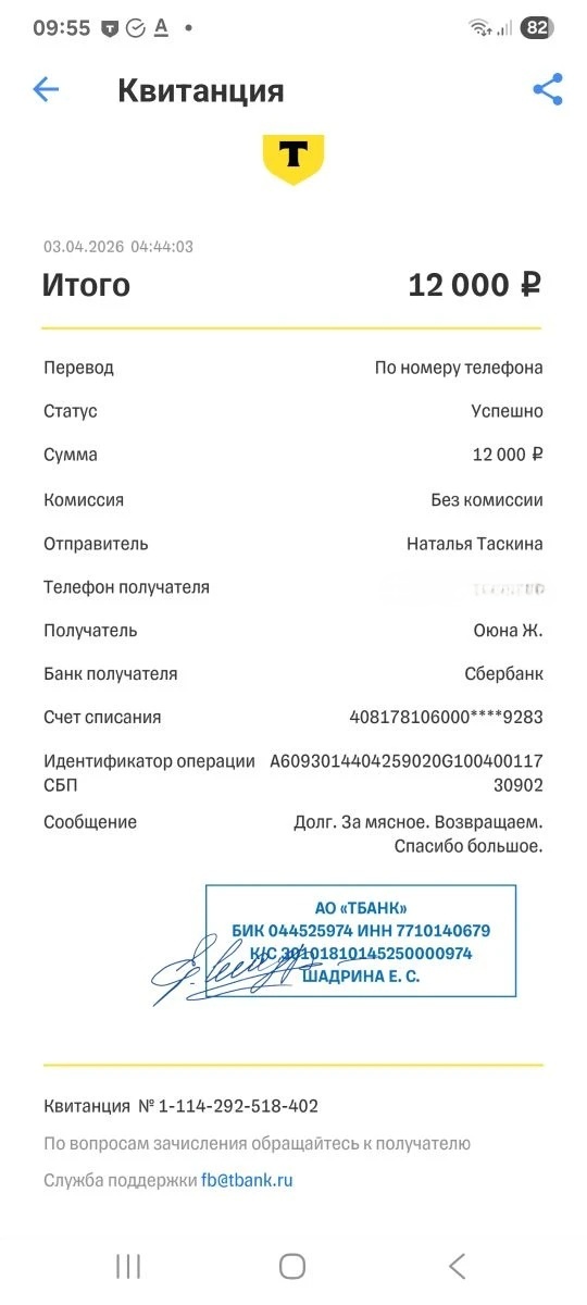 Счёт карты ECMC6914 07:51 Перевод 1500р от Татьяна М. Баланс: 17992р «донат на мясо»