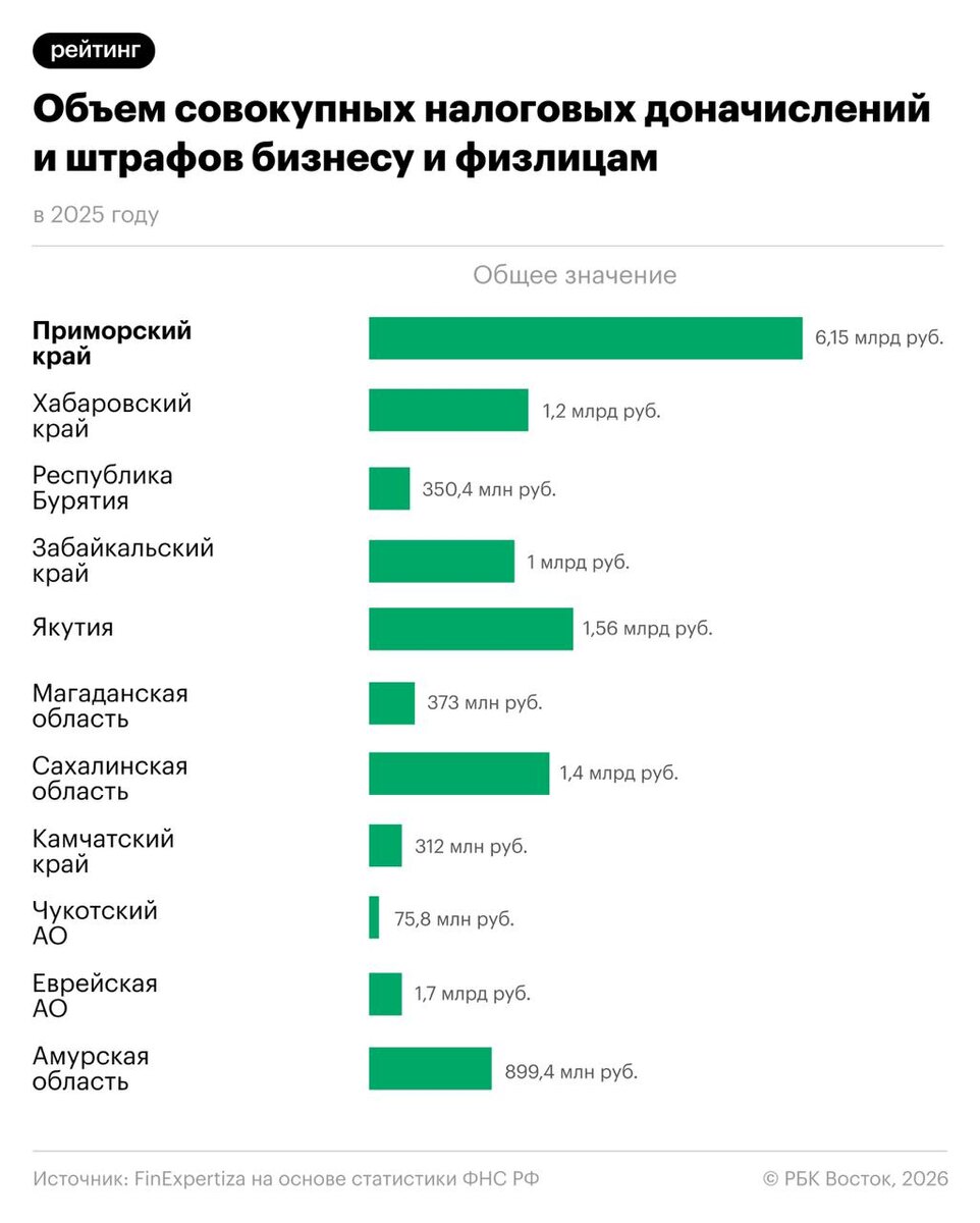 , в регионах Дальнего Востока вырос на 49% По данным аудиторско-консалтинговой сети FinExpertiza, совокупная сумма по округу достигла 15,1 млрд руб. против 10,2 млрд руб. годом ранее. Ключевой вклад в этот показатель обеспечил Приморский край. Эксперты связывают такую динамику с концентрацией налогового контроля на крупных налогоплательщиках и ключевых налогах, прежде всего НДС и налоге на прибыль, которые формируют основную часть доначислений. Подробнее о доначислениях – в инфографике. 🔗 РБК Восток в Telegram и MAX