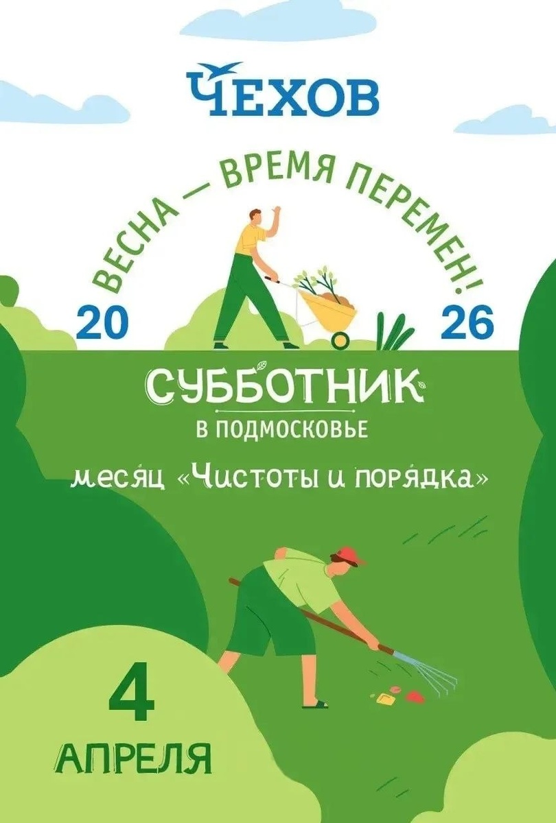 ! Приглашаю вас принять участие в общегородском субботнике, который состоится 4 апреля в 10:00. Вместе приведем в порядок наши улицы, парки, скверы и другие общественные места. Адреса на эту субботу: 🔹ул. Чехова д.85 вдоль прудов реки Теребенка 55.144914, 37.464999 🔹ул. Гагарина от рынка до д. 43 55.164770, 37.429356 🔹ул. Вишневый б-р, д. 7 до ул. Товарная 55.144358, 37.488808 🔹ул. Пионерская, д. 10 до ул. Мира 55.149659, 37.479320 🔹 д. Чудиново 55.145672, 37.539366 Зовите с собой друзей, семью, коллег и знакомых - вместе мы сможем сделать наш округ чище и комфортнее. Всех обеспечат инвентарем и хорошим настроением! @Антон Червяков #АнтонЧервяков #Чехов #ГоспабликиМО