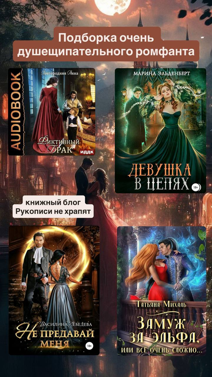 Подборка для вас "Очень душещипательный ромфант" 1. Анна Завгородная "Фиктивный брак" 2. Марина Эльденберт "Девушка в цепях" 3. Василина Лебедева "Не предавай меня" 4. Татьяна Михаль "Замуж за эльфа, или всё очень сложно..." #подборка