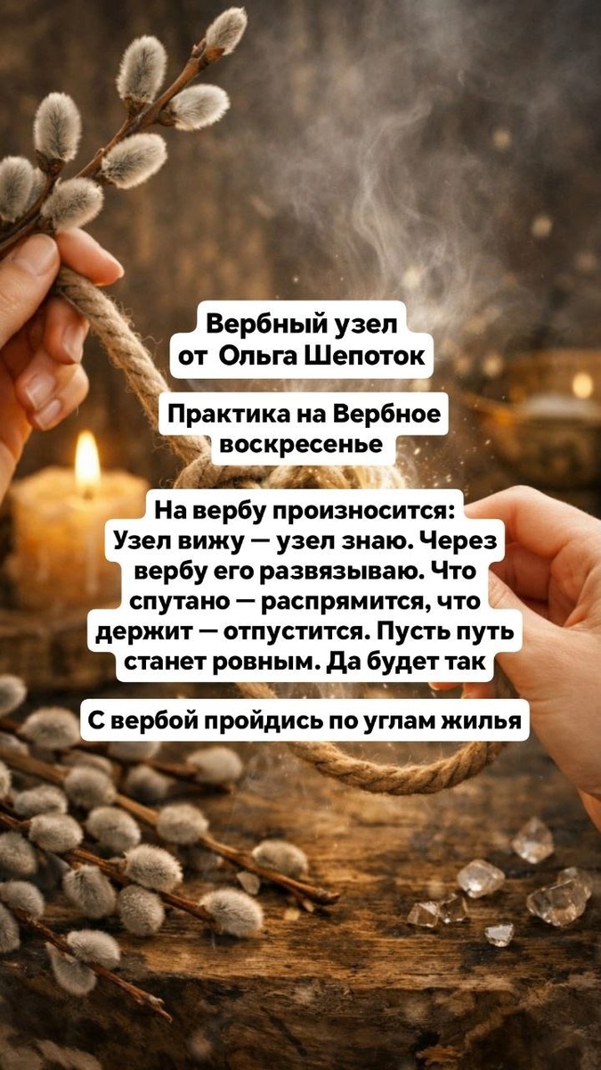 ) Даю вам практику “Вербный узел” 🌿 Узел — это древний символ. Это всё, что в жизни “затянулось”: сложные ситуации, зависшие вопросы, внутренние напряжения, отношения, которые не двигаются. В Вербное воскресенье энергия мягкая, но сильная — она не ломает, а распускает, распрямляет, освобождает. И через образ узла мы даём себе разрешение отпустить то, что больше не должно держать. Практика “Вербный узел” Выполняется в тишине, в день Вербного воскресенья или когда особенно нужно облегчение. 1️⃣ Представьте перед собой узел — как образ ситуации, которая запуталась. Возьмите веточку вербы (или удерживайте её в воображении). 2️⃣ Трижды, спокойно, произнесите: 🔮 «Узел вижу — узел знаю. Через вербу его развязываю. Что спутано — распрямится, что держит — отпустится. Пусть путь станет ровным.» 3️⃣ Медленно проведите рукой, словно развязывая этот узел. 🔸 Представьте, как нити расходятся, и всё становится ясным и лёгким. Обойдите с вербой все углы в доме. Поблагодарите без слов. Остав