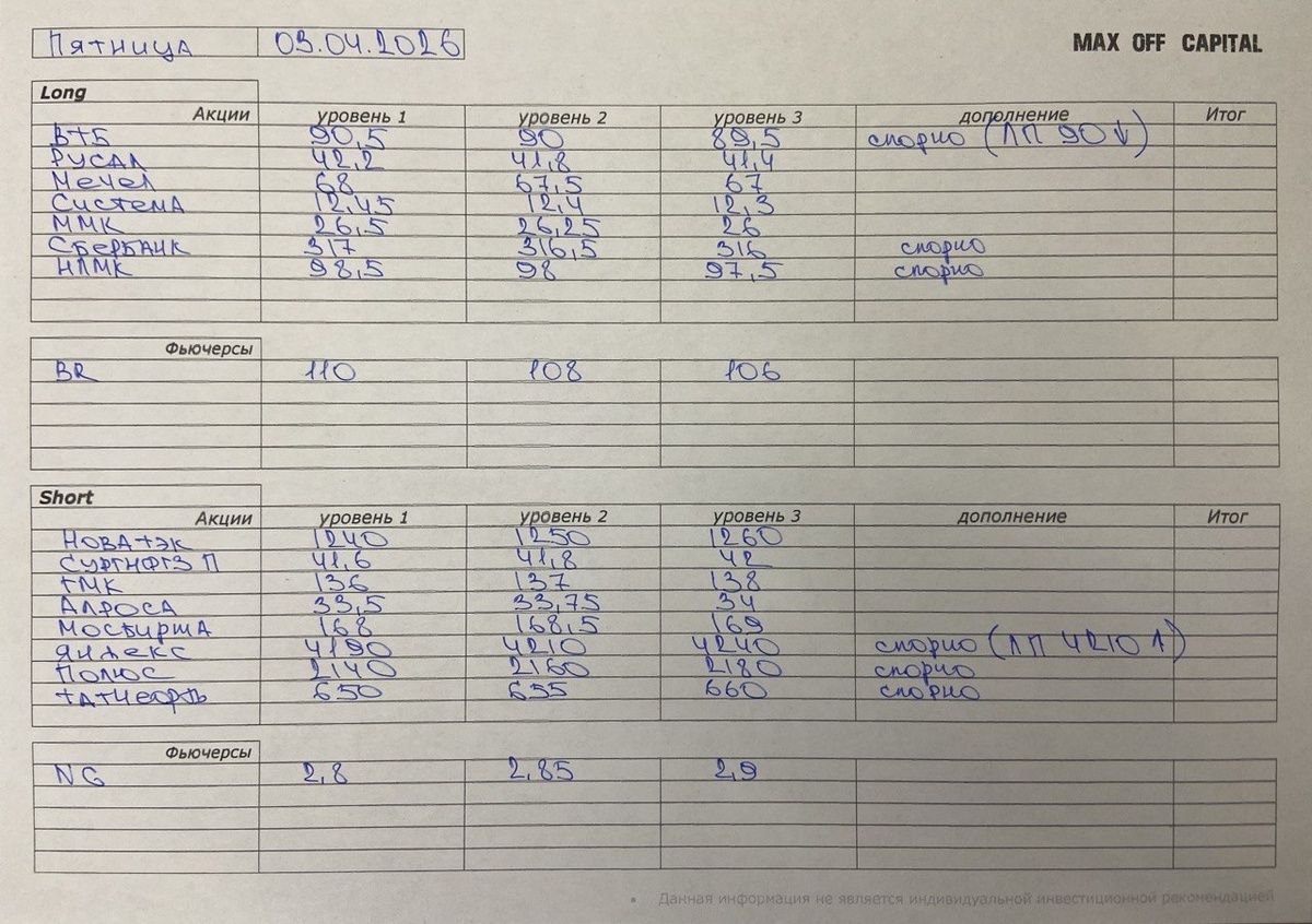 ✅ РЕКОМЕНДАЦИИ НА СЕГОДНЯ ➡️ Личный совет 👍 Сегодняшний день в PRO ▫️ Наши РЕСУРСЫ 😉 Стратегия ЗАДЁРГА 😉 Как пользоваться рекомендациями 😉 Как пользоваться ATR 😉 Видео моих сделок 😉 Куда ставить СТОП 😉 Дневник трейдера 😉 Как определить точку входа Уровни (часть 1) Уровни (часть 2) ТОЧКА ВХОДА Часть1 ТВХ Пробой ТВХ ЛП1Б (ложный пробой 1 баром) ТВХ ЛП2Б (ложный пробой 2 барами) ТВХ СЛП (сложный ложный пробой) ТВХ Отбой 1 баром ТВХ Отбой 2 барами ТВХ Дополнение Как рассчитать ATR Таблица рсчёта ATR Вероятности на рынке (часть1) Вероятности на рынке (часть2) Худшие дни для торговли на Бирже Зачем нужен индекс ММВБ Хватит делать эту ошибку Как работает крупный участник Что такое сильнее рынка Кто за кем ходит Как выбрать направление Где смотреть ИНДЕКСЫ и ТОВАРЫ 💬 Бесплатный | Чат - ПЕРЕЙТИ ❗️ Помним, что сегодня Пятница и многие спекулянты захотят зафиксировать свою прибыль ! #рекомендации