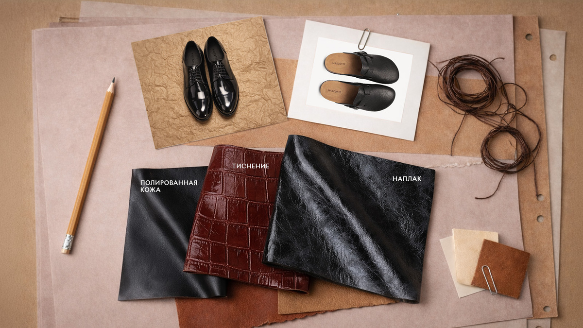 Внешний вид и долговечность кожаной обуви зависят не только от качества сырья, но и от способа финальной обработки поверхности. Важно разделять этап колористики (придание коже цвета) и этап технологической отделки, которая определяет фактуру и защитные свойства материала. Рассмотрим три типа финишной отделки, которые мы используем при производстве изделий Mascotte: Данный вид обработки представляет собой нанесение на лицевую поверхность кожи тонкого лакового слоя при котором остается видна сама фактура кожи. Технологически это достигается за счёт минимальной толщины покрытия, которое не перекрывает поры и природный рисунок, а лишь придаёт им дополнительную глубину и лёгкий блеск. Существует две основные разновидности наплака. Первая — гладкий наплак, который даёт ровную, чуть мерцающую поверхность, где природная фактура кожи остаётся хорошо различимой. Вторая — наплак с ломаным рисунком, или кракелюр: в этом случае на эластичную основу наносят более хрупкий лаковый состав, который при