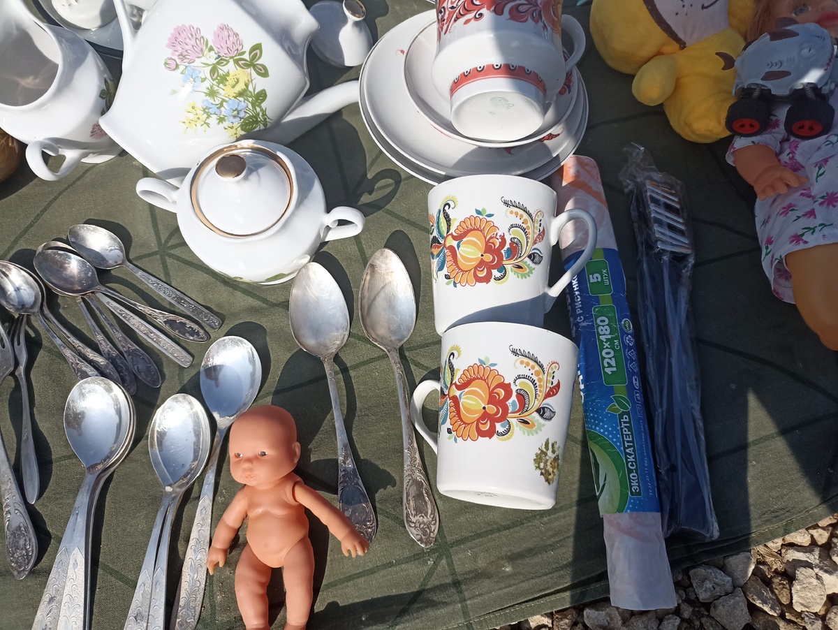 Я старалась изо всех сил, честно! Комментаторы меня часто ругают, что обзоры пишу без ценников на товары. Прошу прощения сразу и объясняю, что цены сами по себе мне вообще не интересны. Я даже не знаю, сколько точно стоят хлеб, сахар, картошка и т.п. - только приблизительно. Мой муж всегда меня ругает за это - мол, надо знать такие вещи. А я что могу поделать, если эта информация не держится у меня в голове. Так и с товарами на барахолке происходит. Мне нравится рассматривать предметы и только уж если я действительно чем-то действительно заинтересуюсь, то только тогда спрашивать стоимость. И то не факт, что я запомню точную цифру. Но я старалась! Итак, давайте посмотрим, что же было на прилавках блошиного рынка в Керчи в последние выходные марта 2026 года: Крупные чайные кружки продавались по 120 руб/шт (но вслед продавец уже кричала, что отдаст по 100). Интересные кружки большого объема, с ярким рисунком - такие нечасто встречаются у нас в продаже. Поэтому я обратила на них внимание.