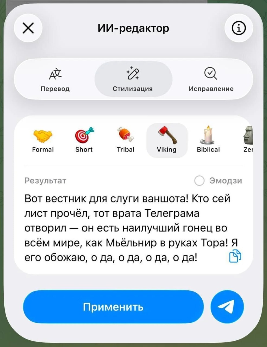 Фича реально очень классная: теперь если вы пишете сообщение длиннее трёх строк — справа сверху появляется кнопочка Ai для редактора. На хрен не нужно, но прикольно Что можно сделать: • Стилизовать текст: под деловой и смешной, например викингов или даже библейский. • Перевести сообщение на другой язык (и тоже стилизовать) • Проверить и исправить ошибки в орфографии и пунктуации. #AI #ИИ #Нейросеть