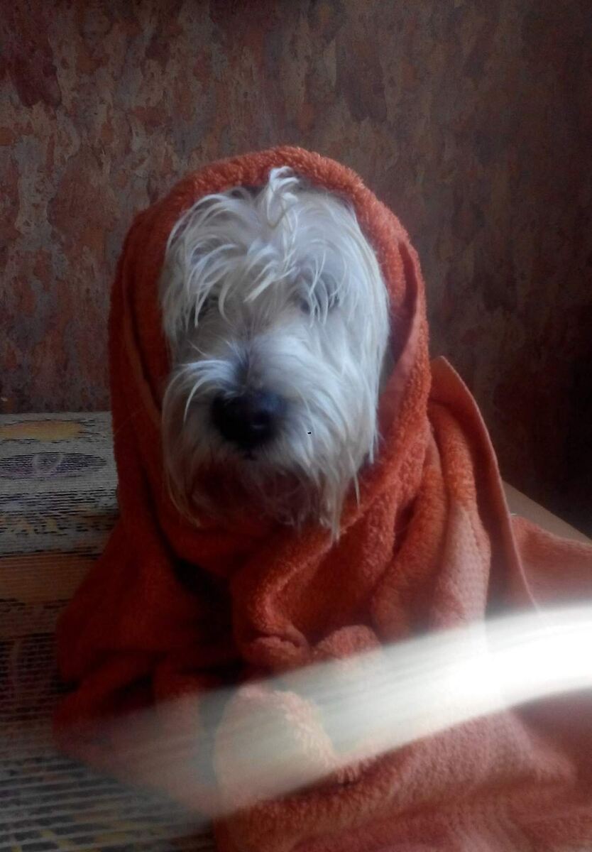 Большинство фотографий с груминга у меня вот такие. Сделать фото "до", обычно, забываю. "После " - лениво, надо же шерсть убрать, собачку красиво поставить. А вот так , в полотенце, очень легко и просто снимать. И время есть свободное, минут 20 "вылёживаться" надо, да и те клиенты, которые у меня не первый раз, знают, что это время покоя, можно расслабиться, отдохнуть, так что никто со стола не